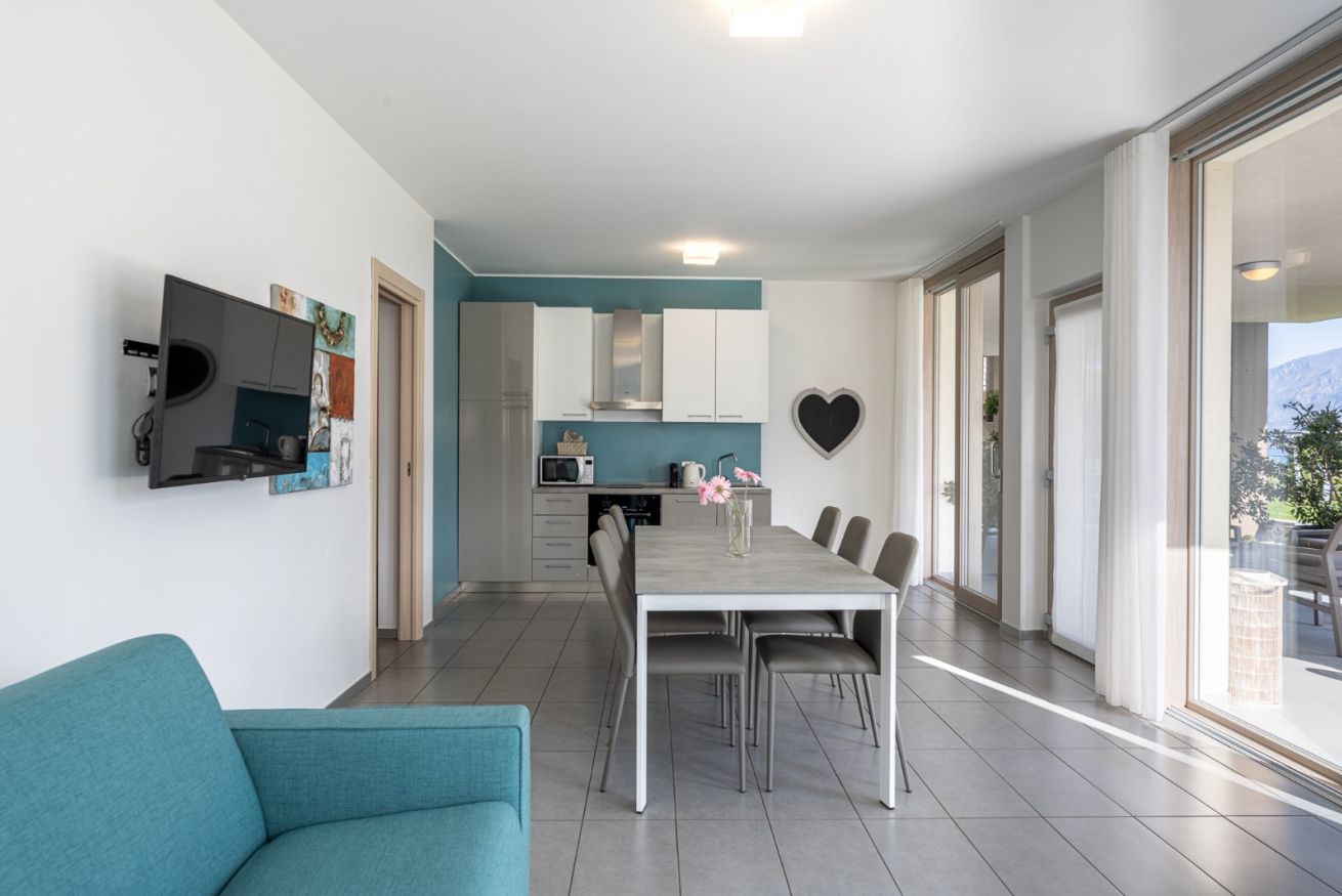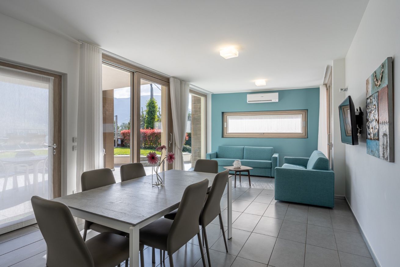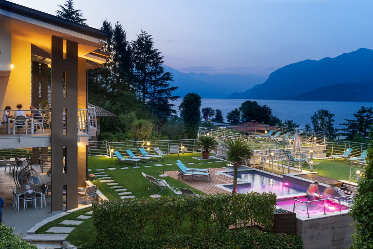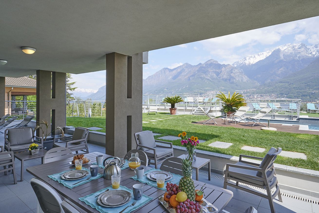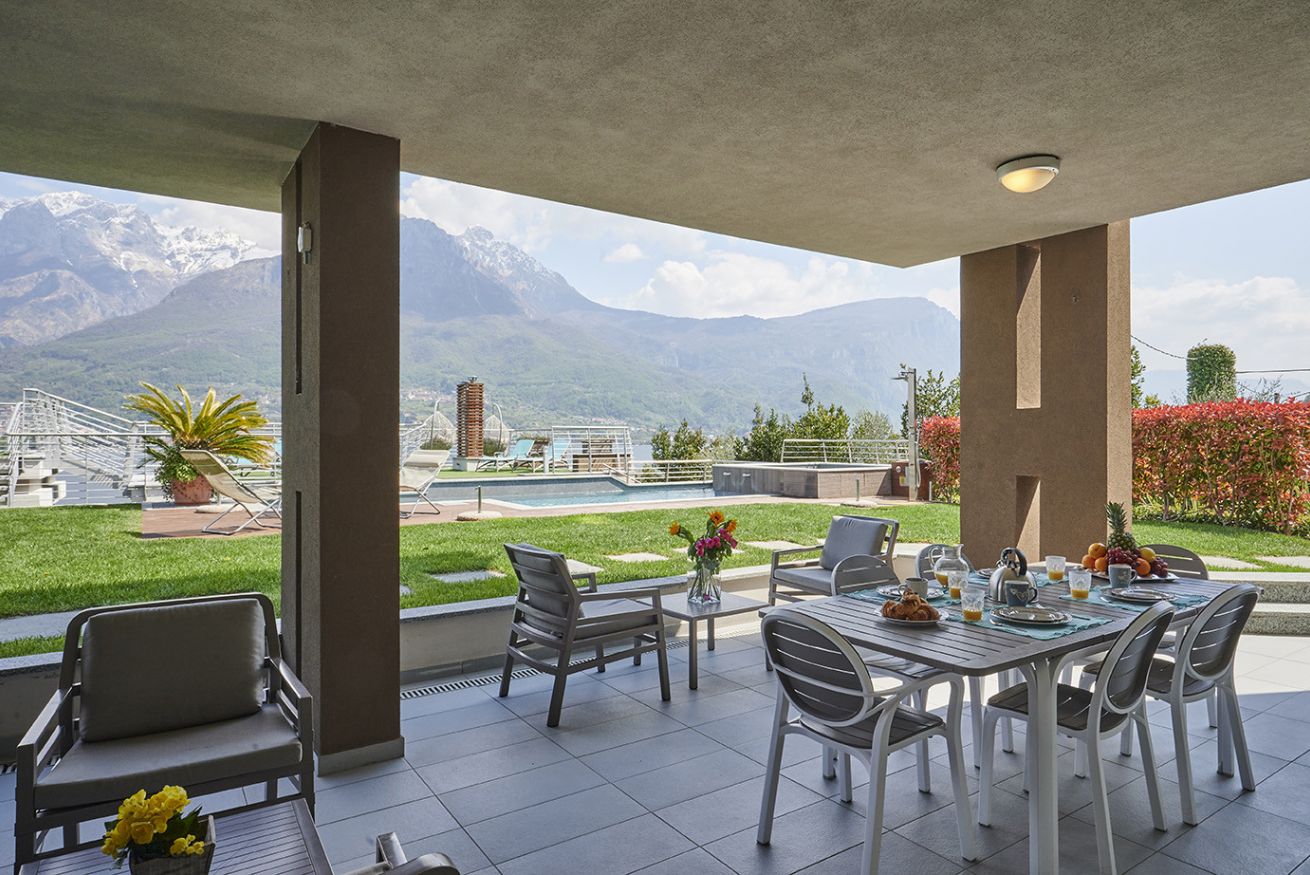 - Terrazza vista lago, che si trova allo stesso livello della piscina e del solarium, dotata di ampio tavolo e arredamenti esterni;